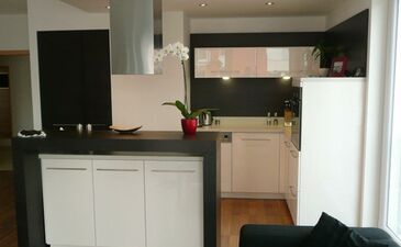 Realizace kuchyně na míru - akrylát, kámen, obklad sklo , dřez Blanco - keramika